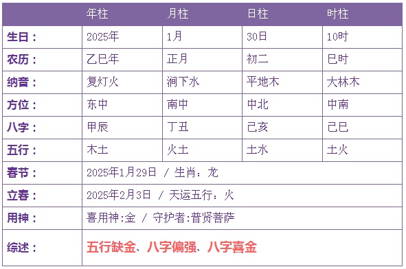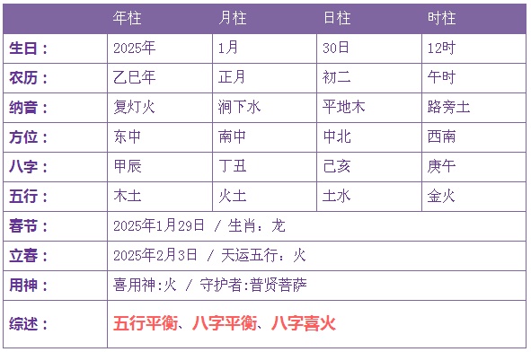 2025年1月30日12时诞生的宝宝五止没有缺