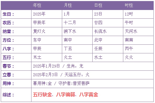 2025年1月23日12时诞生的宝宝五止缺金